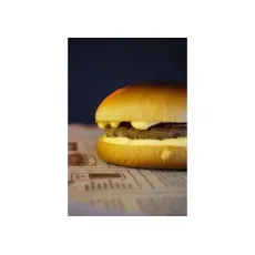 Булочка, две котлеты говяжьи, сыр Чеддер, лист салата, бекон, огурчик маринованный, соус чесночный, соус бургер