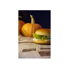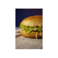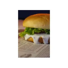 Булочка, котлета говяжья, лук, лист салата, сырный соус