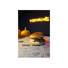 Булочка, котлета говяжья, соус барбекю, соус 1000 островов, огурчик маринованный