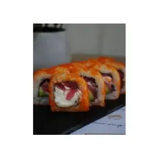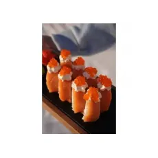 Ролл со сливочным сыром, копченым лососем, помидором, креветкой, в икре тобико. 8шт.