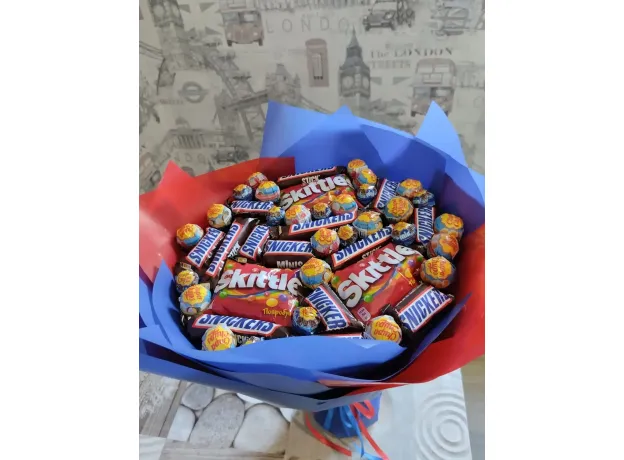 Букет детский с чупа-чупсами,скитлс,сникерсами