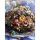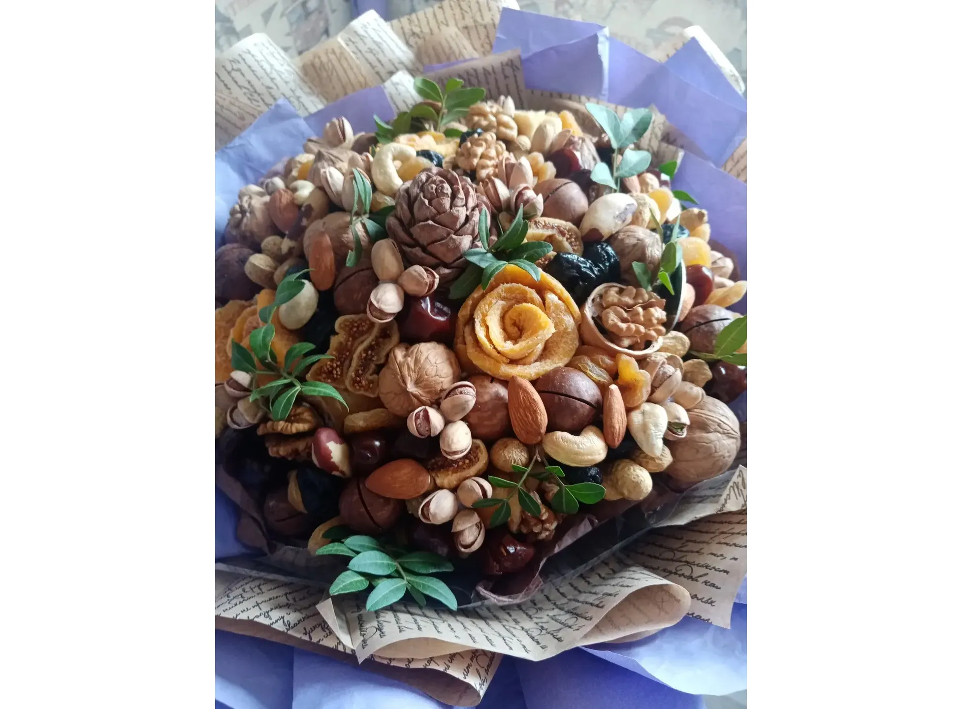 Букет из сухофруктов и орехов прекрасно подойдёт и мужчине, и женщине, человеку кто ведёт здоровый образ жизни и следит за питанием.