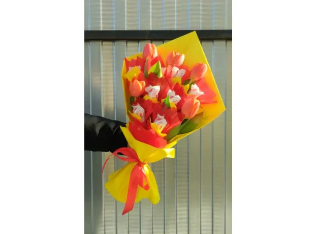 Букет из живых цветов и Раффаэло.Яркий , очень красивый и необычный.
