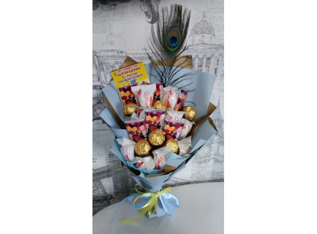 Небольшой букет станет прекрасным дополнением к основному подарку...Нарядный ,с оригинальным акцентом в виде пера павлина,не останется незамеченным...Вызовет бурю эмоций...