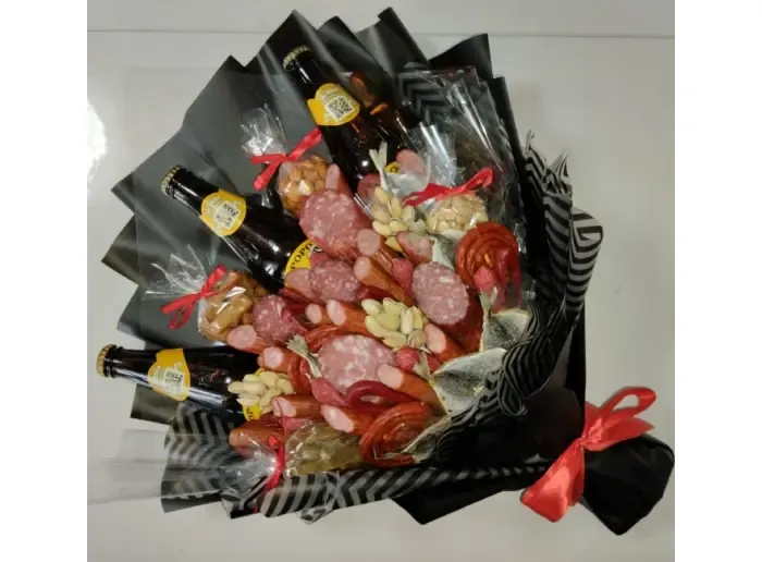 Букет в яркой упаковке.Вкусный мясной,с копчеными сырами и колбасами.также в составе вкусные орешкии и томаты черри.Цена указана без учёта алкоголя.его в букет добавляю или не добавляю по желанию заказчика (оплачивается отдельно по чеку)