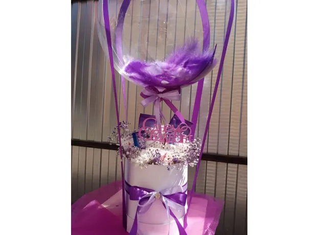 Композиция с шаром баблс в шляпной коробке с живыми цветами