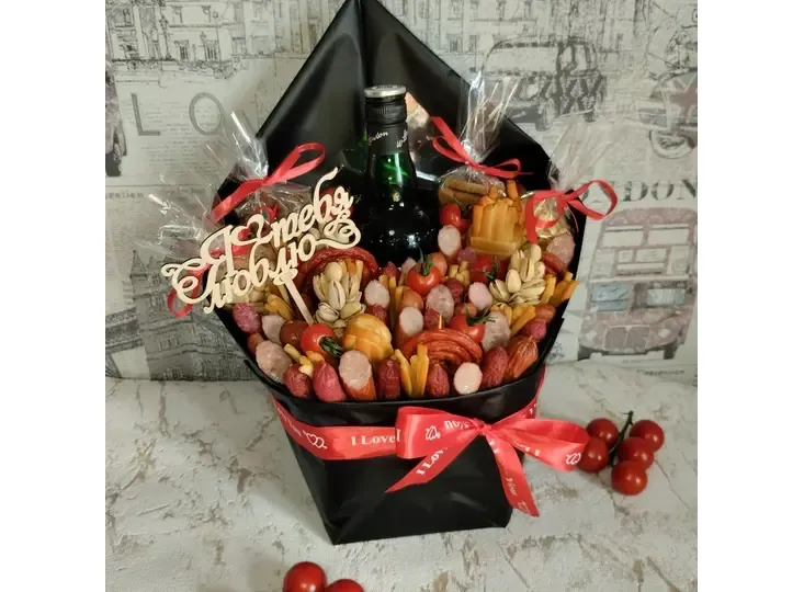 Стильный конверт, с закусками и напитком... Сырокопченые закуски(колбасы и сыры, сухари и орехи), колоски из фисташек, помидоры-черри...Очень вкусный подарок, который вызовет ВАУ-эффект.