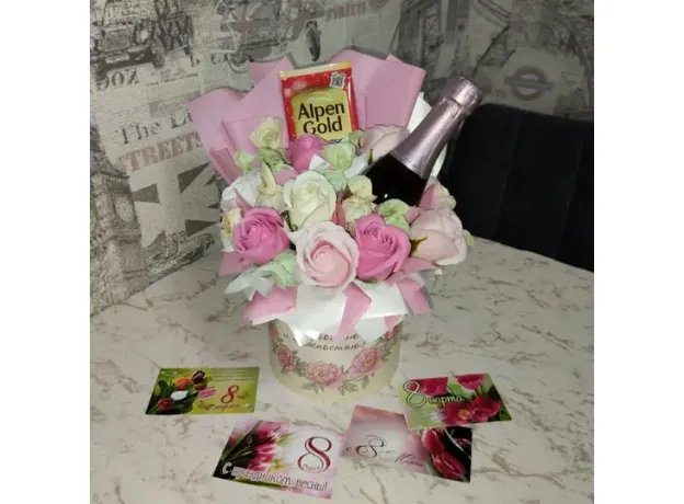"С любовью и нежностью" Шляпная коробка с мини-шампанским и мыльными розами