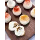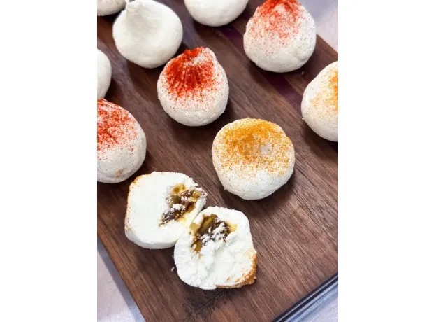 Молодой сыр с грецким орехом и инжиром внутри. Сверху посыпан паприкой, какао и кайенским перцем. Вкус - сочетание творожного сыра, сладкого инжира и острого перца.