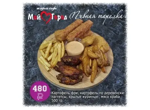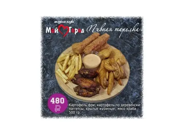Картофель фри, картофель по деревенскинаггетсы, крылья куриные, мясо краба500 гр.