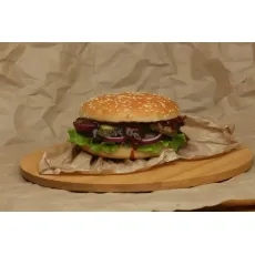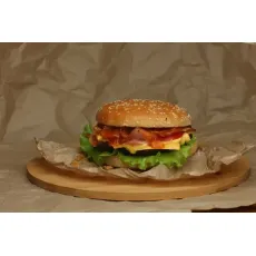 Булка для Бургера, Соус Майонезный, котлета из говядины, Соус Барбекю, Бекон, Огурцы маринованные, Лук красный, Лист Салата.