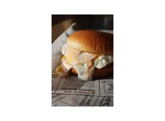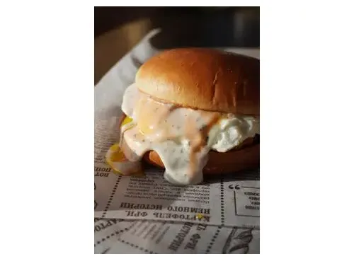 Булочка, котлета говяжья, лист салата, томат, соус чесночный, омлет