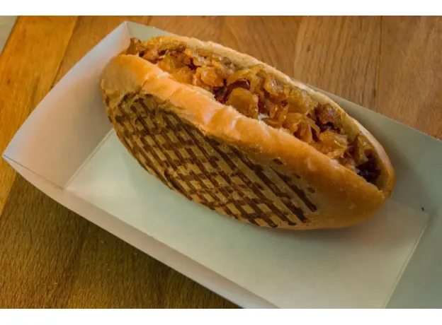 Булочка, сырная сосиска, маринованный огурец, хрустящий лук, кетчуп, майонез, горчичный соусВес: 200 гр.