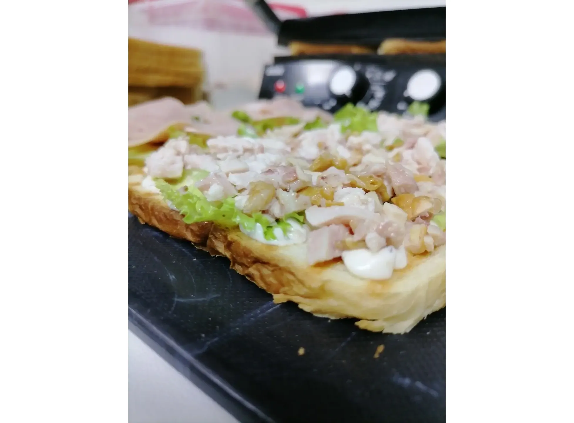Хлеб, соус цезарь, лист салата, мясо курицы, сыр