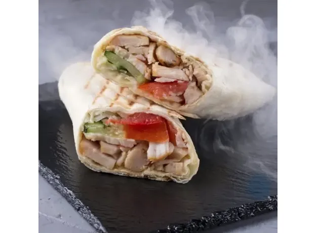 Курица, помидор, огурец, капуста, морковь по корейски, лук, соус сливочно чесночный, соус томатный.