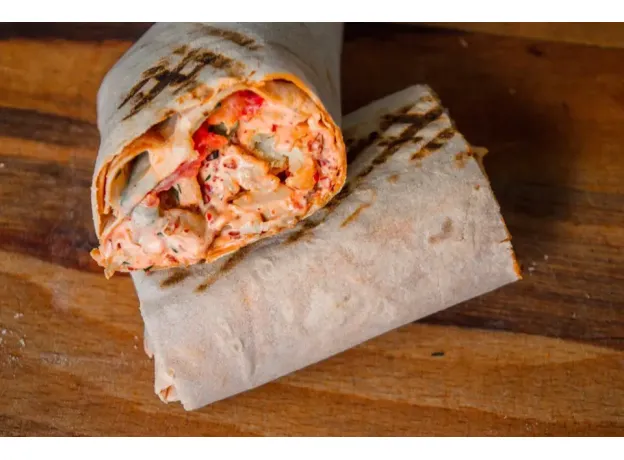 Лаваш с паприкой, огурец, помидор, капуста маринованная, мясо курицы/свиньи, фирменный острый соус, зелень.Вес: 320 гр.