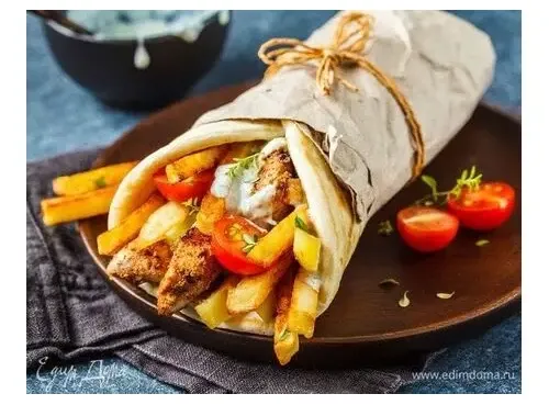 Свинина, лепешка,огурец, помидор, чесночный соус