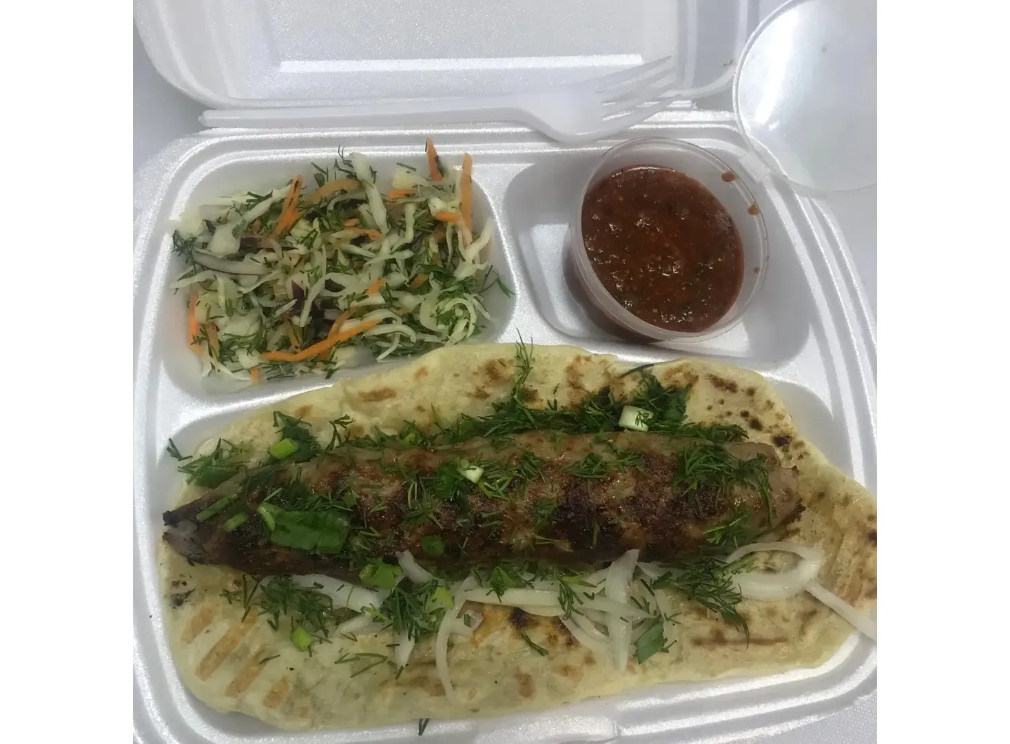 Свинина+Говядина, салат, лепёшка, лук маринованный и зелень по желанию!Соус на выбор : горчичный, соево-чесночный, фирменный с кинзой, красный с чесноком, укропно-чесночный.