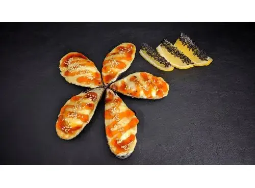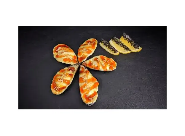 Запеченые мидии в полураковинах под шапкой на Ваш выбор:1) Сырная шапка моцарелла под соусом Унаги и белым кунжутом2) Сырная шапка с острым соусом Спайси-------------------------------------------------------------------------Подается с дольками лимона в черном кунжуте.5 штук