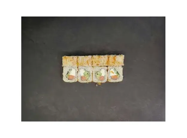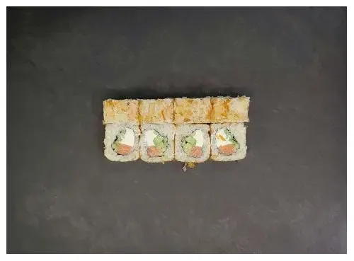 Ролл со сливочным сыром, лососем и огурцом обваленный в стружке Тунца.
