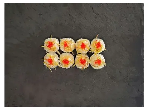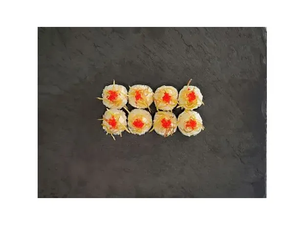 Оригинальный ролл с хрустящим огурцом, под шапкой из коктейльных креветок, в пикантном соусе Васаби, украшенный хрустящим картофелем пай и икрой тобико.