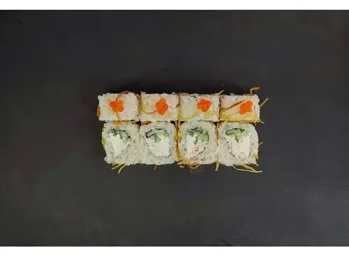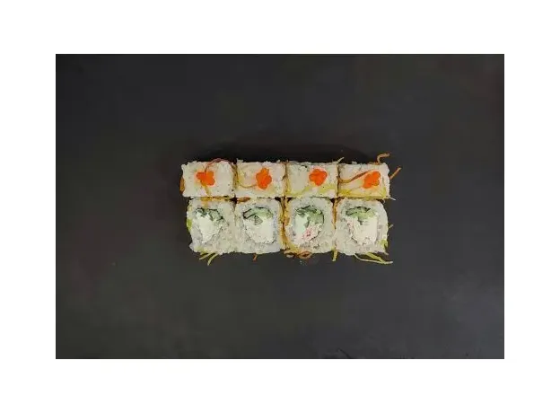 Нежный ролл с начинкой из сливочного Сыра и снежного краба в сочетании с огурцом, покрытый картофелем пай и икрой лосося.