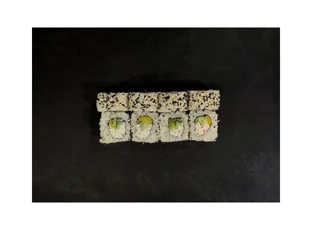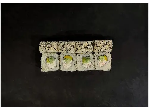 Ролл с начинкой из снежного краба с добавлением огурца и такуана в черно-белом кунжуте.