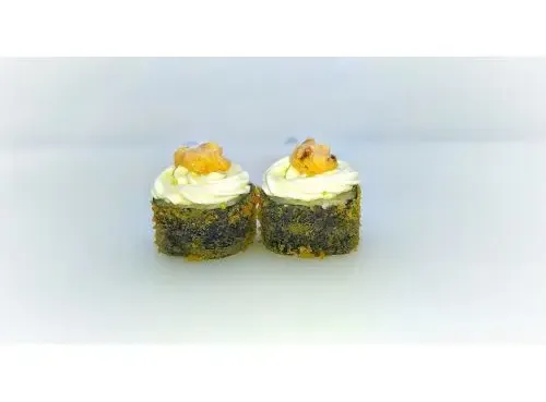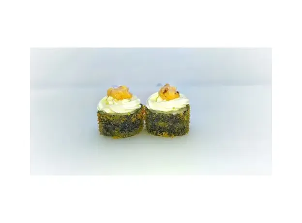 Темпурный ролл со снежным крабом и японским омлетом, под шапкой из сливочного сыра, угря в пикантном соусе СпайсиВес ролла 270 грИмбирь, васаби и соевый соус приобретаются отдельно.