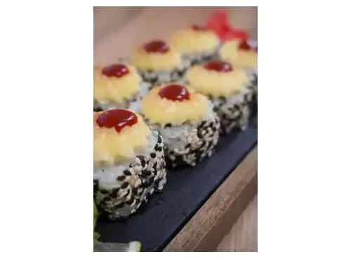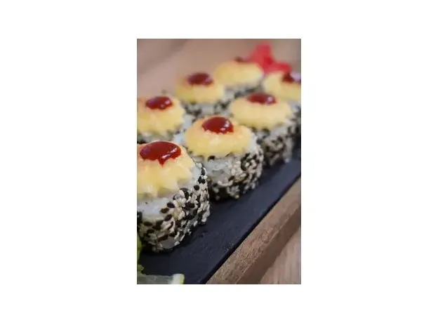 Ролл с курицей и помидором, запеченный под острой шапкой, 8 шт.