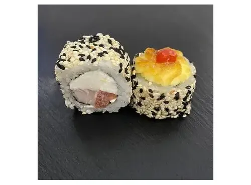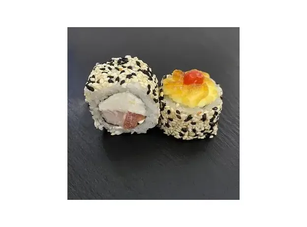 Состав:РисНориТворожный сырКопчённая курочка ПомидорКунжутЗапеченный под шапкой из японского майонеза и полит острым соусом Порция - 8шт.