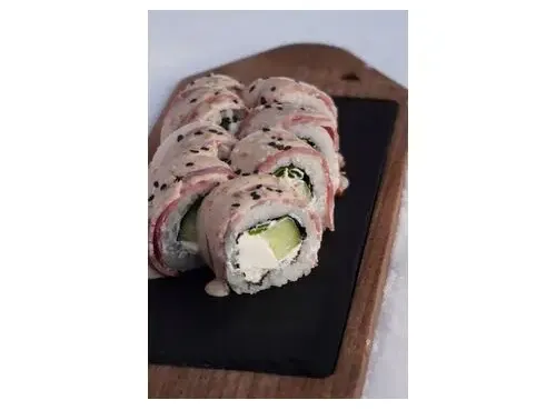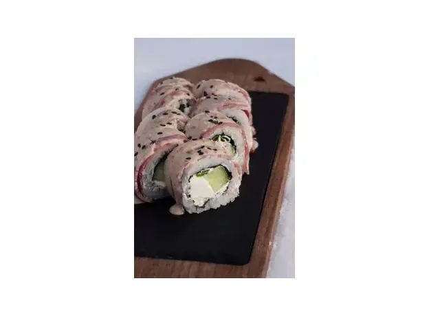 Ролл со сливочным сыром, зелёным луком, огурцом, обёрнутый на 3/4 в бекон. 6 шт.