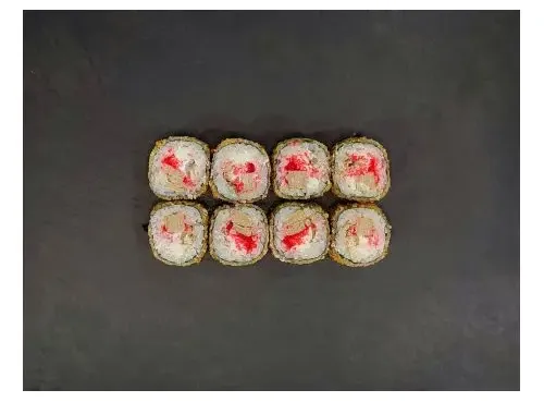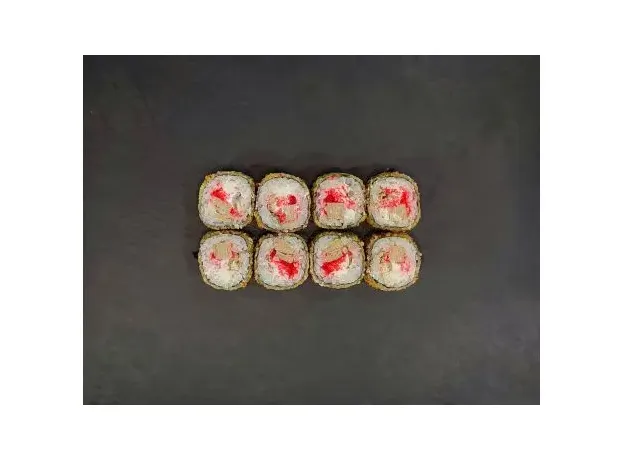 Темпурный ролл с начинкой из угря, сливочного сыра, икры Тоббико и японского омлета Томаго