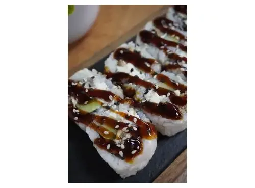 Ролл со сливочным сыром, угрём, огурцом, политый соусом унаги. 8 шт.
