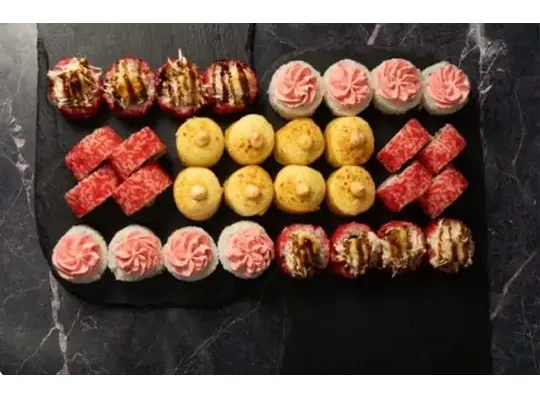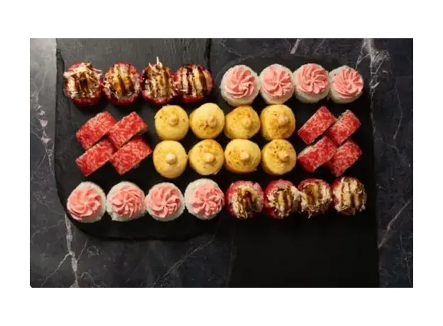 Запечённый краб с пармезаном 8 шт,запечённая тортилья с халапень 8 шт,лава с лососем 8 шт, Калифорния 8 шт.
