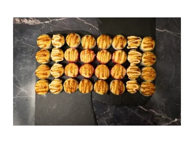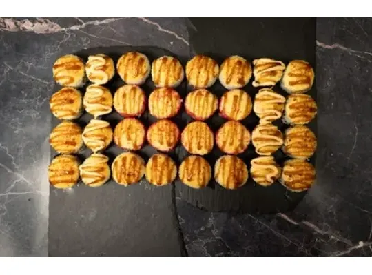 Запечённый с лососем терияки 8 шт,запечённый с лососем и халапеньо 8 шт,запечённый с угрём 8 шт, запечённая калифорния 8 шт.
