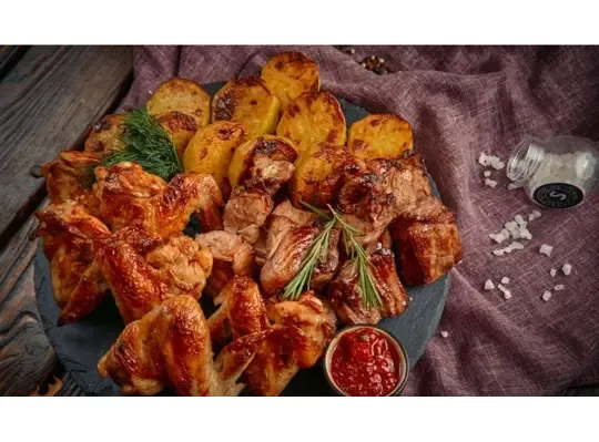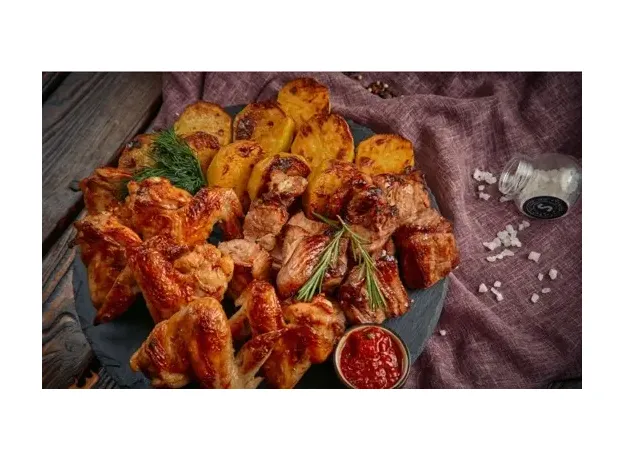 Шашлык из свиной шеи 2 порции,крылья куриные 2 порции,картофель 2 порции, соус томатный, лук маринованный
