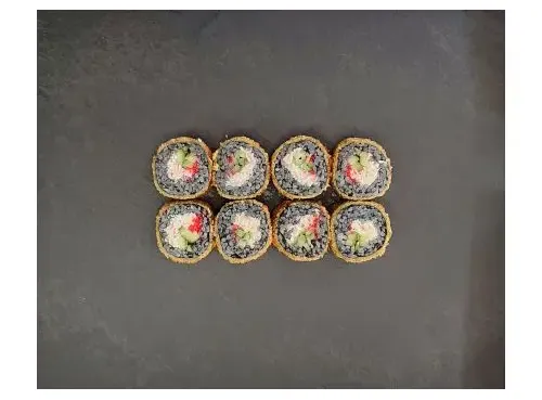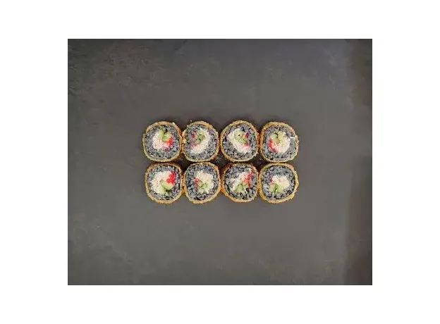 Темпурный ролл с добавлением чернил каракатицы, с начинкой из снежного краба, огурца и красной икры Тобико.