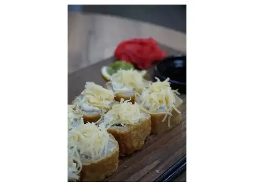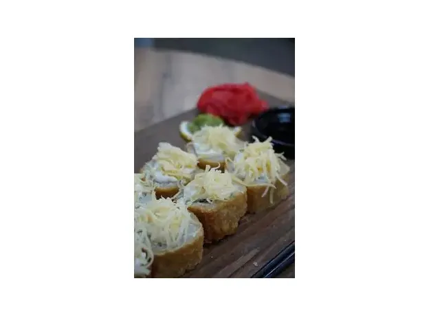 Ролл с копченой курицей, помидором, пекинской капустой, жареный во фритюре, с шапкой из соуса цезарь и сыра пармезан, 8 шт.