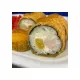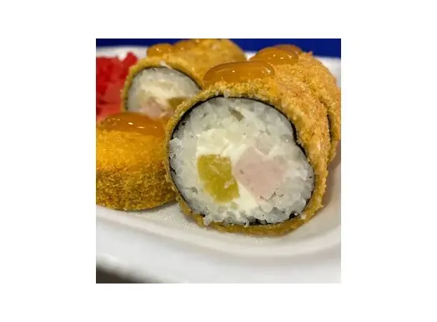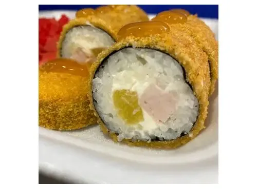 Состав: РисНориТворожный сырКопченная курочка Ананас Жаренный во фритюре Полит кисло-сладким соусом Порция - 8шт