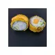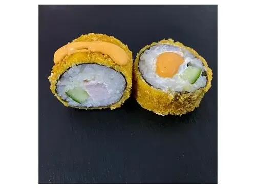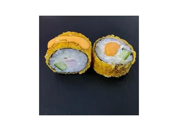 Рис, нори, творожный сыр, копченная курочка, огурец, кляр, сухари панко, зажарен во фритюре и полит спайси соусом. 8шт.