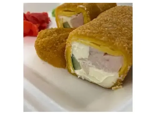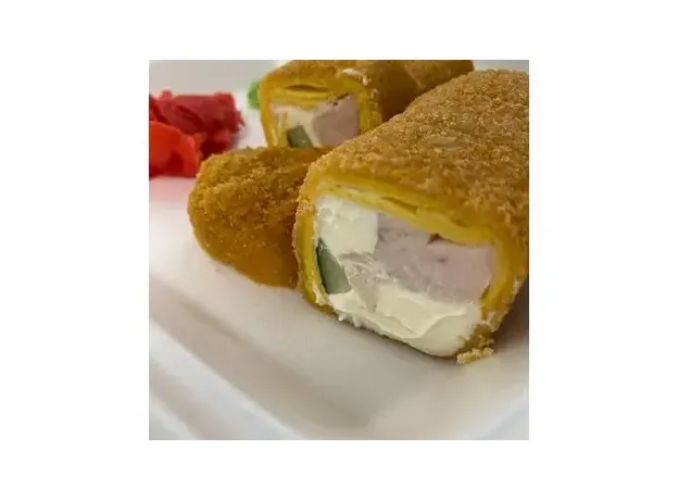 Сырная лепешка, творожный сыр, копченная курочка и свежий огурец, обвален в кляре, посыпан в сухарях панко и обжаренный во фритюре. 8шт.