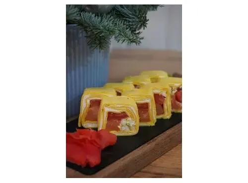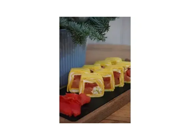 Сырная лепешка, пекинская капуста, сливочный сыр, помидор, копчёный лосось