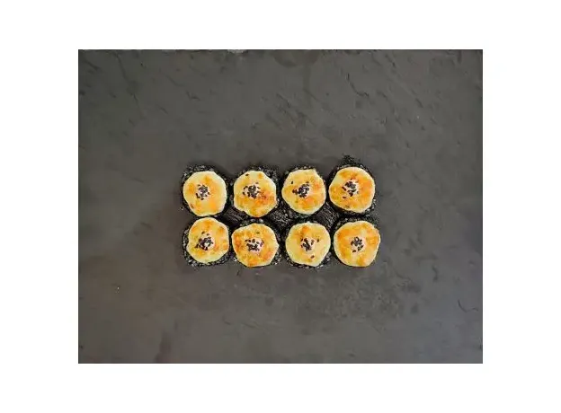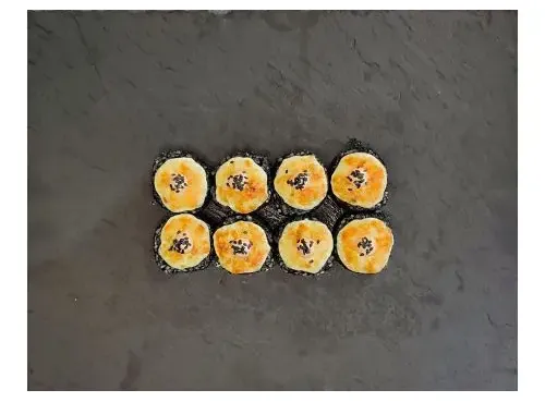 Пикантный запеченый ролл с начинкой из курицы, бекона и огурца в черной икре Тобико, под шапкой из сыра Моцарелла, с соусом спайси и черным кунжутом.