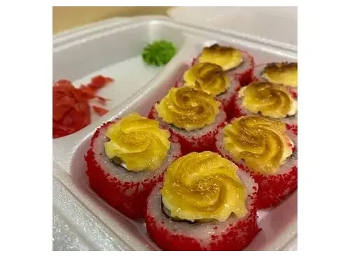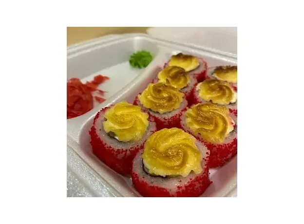 Рис, нори, творожный сыр,креветка, икра масаго, запеченный под шапкой из японского майонеза. 8шт.