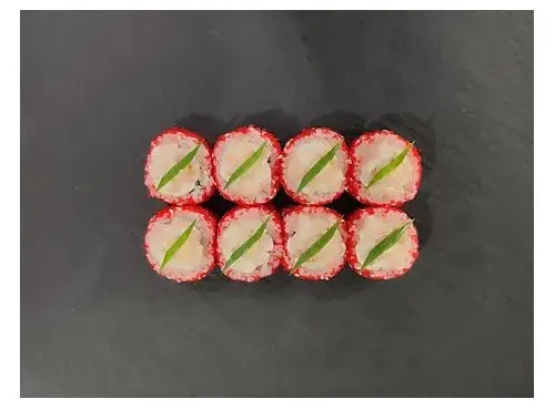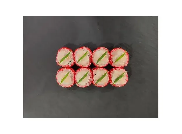 Ролл с хрустящим огурцом и лососем, под красной икрой летучей рыбы и кунжутом, с шапкой из лосося и японского майонеза с добавлением соуса Спайси и перьев зеленого лука