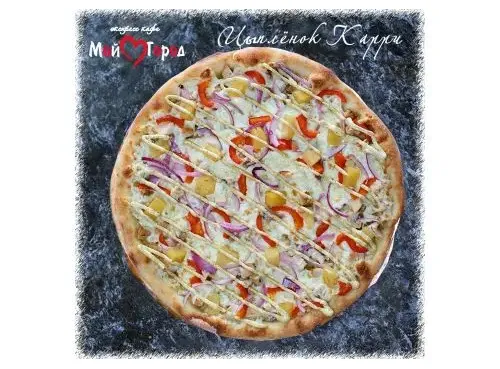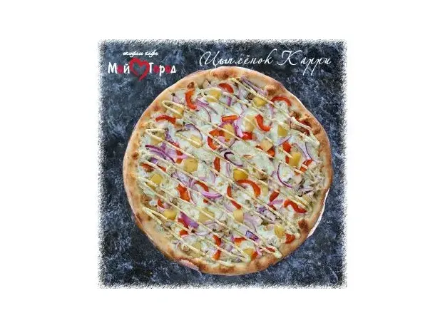 курица, перец болгарский, лук красный маринованный, ананас, соус кари и сыр моцарелла.