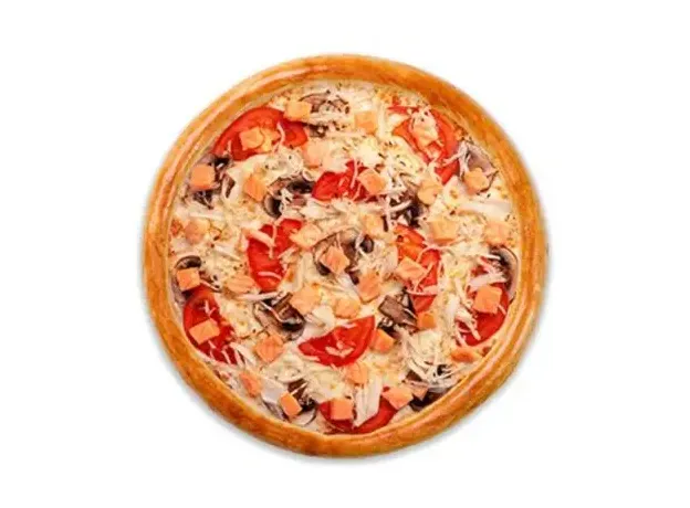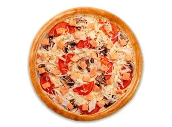 Тесто, белый соус, моцарелла,шампиньоны, помидоры, снежный краб, лосось слабо солёный. Вес 700гр.