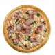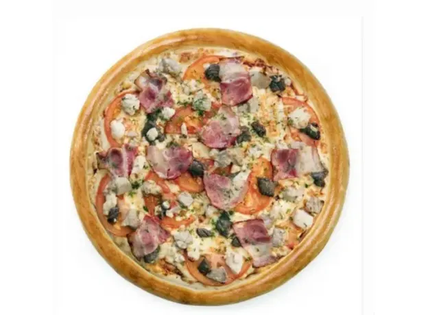 Тесто,Пицца соус, сыр моцарелла, помидоры, ветчина, свинина, грудка куриная, бекон, зелень.вес. 650гр