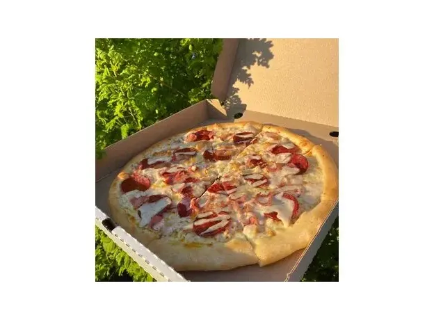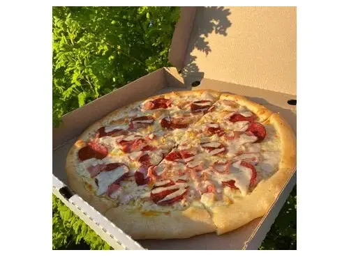 Фирменный соус, копченная курочка, сыр моцарелла, украшена пикантной колбасой пепперони и беконом, полита ореховым соусом.Очень сытная пицца ??