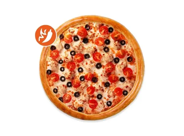 Тесто, острый пицца соус, моцарелла, курица, помидоры черри, маслины, вес 600гр